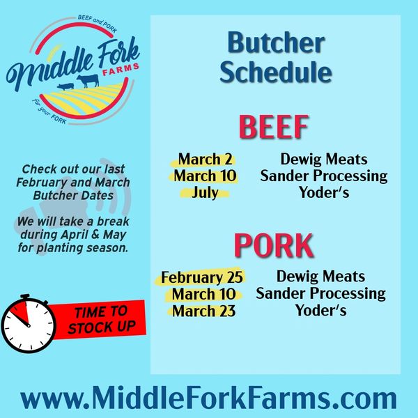 Middle Fork Farms complies with the Indiana State Board of Animal Health Custom Processing rules and works exclusively with USDA-approved Custom Butcher Shops. All custom sales are final, non-refundable, and not available for resale.